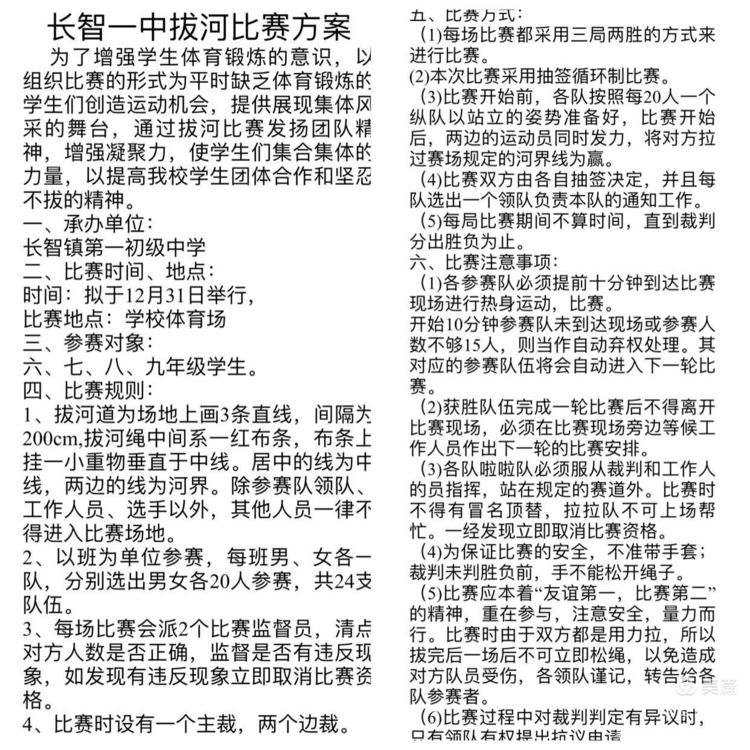 2020年12月31日下午,开封市通许县长智镇第一初级中学在学校操场上,成功举办了“迎元旦”同级男、女生拔河比赛。全校24支参赛队伍参赛,历时将近两个小时。各个参赛队伍士气高昂。