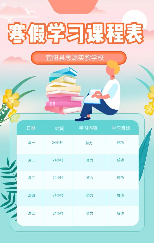 同学们,寒假已至,为了让大家在假期做到离校不离学,过一个快乐而充实的寒假,洛阳市宜阳县思源实验学校特意为各级学生制定了规范合理完善的课程表。