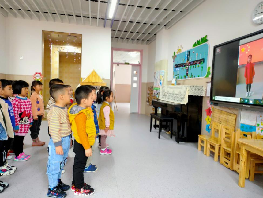 开学典礼上,园长徐艳要求全体教职工要把安全时时刻刻放在第一位,确保贯彻执行上级要求不走样,各项安全工作和保育工作不松懈。为丰富开学首日活动,益文幼儿园教师经过反复研讨,特别制定了《开学第一课》主题方案,围绕“幼儿园一日生活”、“教师职业行为道德规范”、“疫情防控流程”“消毒方法”等方面开展了系列培训活动,组织教职工进行了深入细致的全方位学习,规范、细化各部门制度和流程,切实提高幼儿园工作质量。开学首日,由于天气原因,烟台高新区益文幼儿园组织孩子们在室内举行了升国旗仪式。