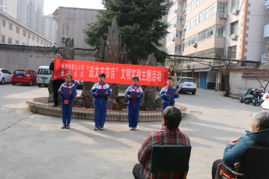让文明之光照亮新征程——林州市第九小学开展“新时代文明实践推动周”系列活动时间:2021-03-09 为认真贯彻落实关于首届“新时代文明实践推动周”活动有关工作要求,大力培育和践行社会主义核心价值观,推动《安阳市文明行为促进条例》贯彻落实,大力普及文明行为规范,提升社会文明程度,为新时代高质量发展建设营造良好社会环境。林州市第九小学于3月2日至6日,结合学校实际开展了一系列主题文明实践活动:“讲文明礼仪”宣传进社区、学习“四史”教育、“送文艺”进社区、学雷锋“献暖暖爱心”、“绿水青山就是金山银山”、环境保护宣传活动。