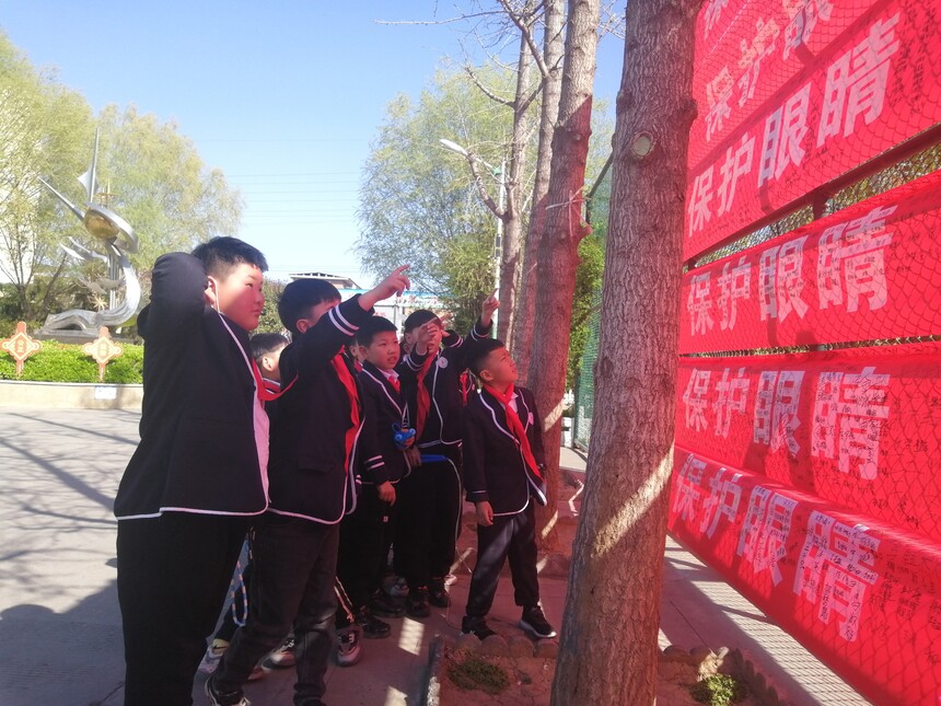 线下通过建立学生视力健康电子跟踪档案、设立班级学生“视保员”、加强眼保健操检查评比、召开预防近视主题班会、学生在“保护眼睛”宣传条幅上签名和家长学校活动等,引导教育广大学生培养“呵护好眼睛,才能拥有光明的未来”的健康意识,每节课间走出教室活动、远眺,规范“三姿”,养成科学用眼、保护视力的好习惯,把爱眼护眼的健康理念深植内心,付诸行动,从现在做起,均衡饮食、合理作息、少用手机,呵护眼睛,拥有一个光明的未来,长大后报效祖国。(焦作沁阳市实验小学供稿)