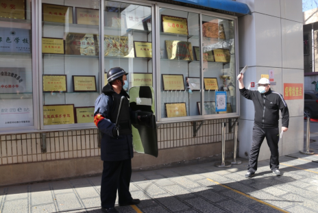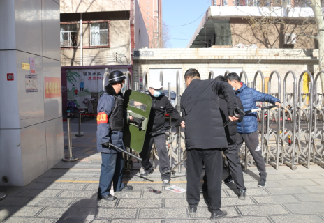 演练前,学校精心制定演练方案,成立了演练领导小组,召开了专题安排部署会,对各项应急措施进行了周密部署,并对钢叉、盾牌等防卫器具进行了讲解说明。 防暴恐的演练开始,一名情绪激动的“暴徒”强行闯入中心路小学大门,意图进入校园,与学校保安发生激烈争执,保安阻拦无果后,该“暴徒”突然拿出一把尖刀挥舞,随时可能对学校师生造成人身伤害。另一名保安见状迅速启动一键式报警器并紧急呼叫支援,后协同与持刀“暴徒”对峙,对峙中一支由教师组成的护校队赶来支援,大家齐心协力下用钢叉和盾牌将“暴徒”逼到墙角,最终成功夺下手中刀具并将其制服。
