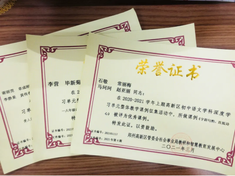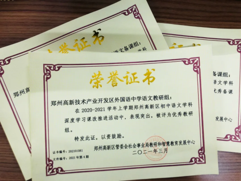 语文教研组荣获“2021年高新区初中语文学科深度学习研究优秀教研小组”。 3名教师荣获“2021年高新区初中语文学科深度学习研究优秀组织者”。 10名教师荣获“2021年高新区初中语文学科名著助推课微课课例奖励”。