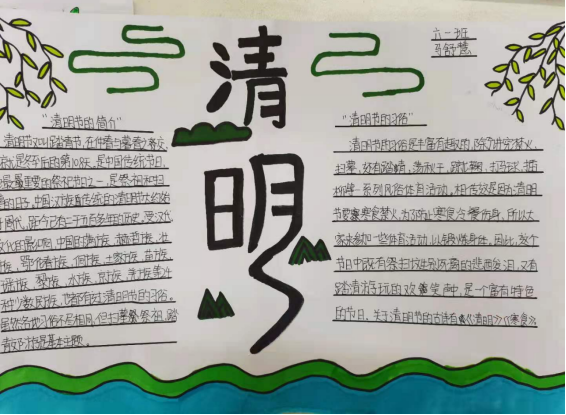 同学们利用课余时间,认真搜集有关清明节的起源、习俗等方面的知识,整理了关于革命烈士的故事、诗篇等内容,精心设计手抄报的版面,并结合优美的文字来诠释“清明节”的意义。