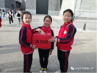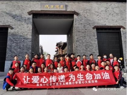 让爱心传递,为生命加油——许昌市文峰路小学爱心义卖活动时间:2021-04-01 爱是人间的暖阳,温暖着每一颗心灵;爱是人间的春雨,滋润着每一个生命。3月28日下午,在班级的组织下,在家委会的大力支持下,许昌市文峰路小学四、五年级的志愿小记者来到曹魏古城、西湖公园,开展爱心义卖活动,为八一路小学身患白血病的黄宝祥同学捐款。 “叔叔,买份报纸,为生病的同学献份爱心吧!”“阿姨,这个同学很需要帮助。您能献份爱心帮帮他吗?”一句句纯真的话语换来一份份珍贵的爱心。