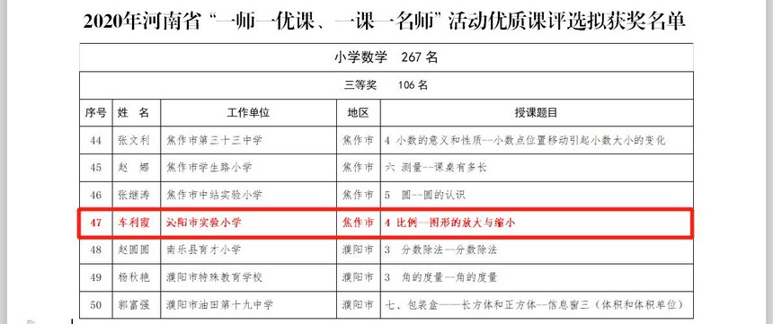 其中,车利霞老师荣获河南省2020年度“一师一优课、一课一名师”活动优质课三等奖。特向获奖教师表示衷心的祝贺!(焦作市沁阳市实验小学供稿) |