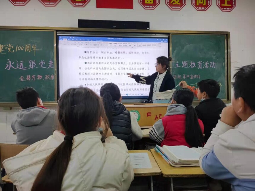 首先,校长王伟杰组织全体教师开展了民族宗教政策法规宣传推进会,会上校长王伟杰领读了《宗教政策法规明白卡》,带领大家认识到我国对于宗教的有关政策规定,做到“两个不得,五个严禁”。随后各班班主任组织本班学生召开了相关班会,传达了相关精神,并带领同学们围绕正确的宗教信仰进行讨论交流,并指出做好宗教工作,必须坚持党的宗教工作基本方针,积极引导宗教与社会主义社会相适应,坚持教育与宗教相分离。每位同学都认真专注的听着,探讨着,同学们表示对此十分关注。班会最后,通过知识竞赛的方式,对大家的宗教知识进行检验,真正记在心里,落在行动上。同时,还积极利用电子屏和班级群向孩子们和家长推送相关政策法规。