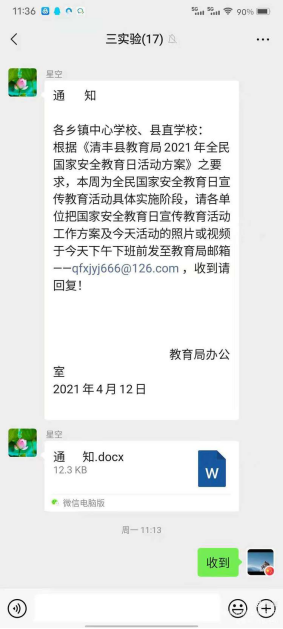 濮阳市清丰县第三实验小学举办2021年“全民国家安全教育日”主题活动时间:2021-04-29 为增强学校全体师生国家安全意识,维护国家安全,丰富学校全体师生国家安全常识,按照上级文件指示精神,濮阳市清丰县第三实验小学于4月15日上午举办“清丰县第三实验小学2021年全民国家安全教育日”主题活动。