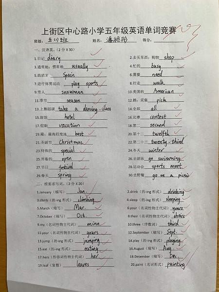 一份耕耘,一份收获,喜悦的背后必有辛苦的付出。经过英语组老师们一番仔细的评卷阅卷,各班决出此次比赛的前五名予以表彰。 本次英语单词竞赛不仅提高了学生学习英语的兴趣,培养了学生识记单词的良好习惯,给学生提供了展示自我的舞台,更是为全面提升英语教学质量打下了坚实的基础。(郑州市上街区中心路小学 张桐 孙婉茹) |