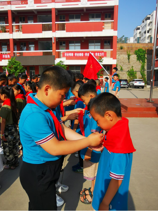 在鲜艳的队旗下,大队长带领新队员庄严地宣誓。鲜艳的红领巾映着新队员的张张笑脸,那是他们在为自己终于能加入到少先队这个大集体里而骄傲自豪。