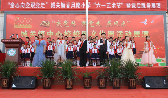 全体教师早早到校做准备工作,有的负责剧务,有的负责候场,有的负责引领,有的带领孩子化妆,有的维持班级秩序,有的组织孩子入座……分工明确,井然有序,每一个瞬间都展现出春风这个大家庭的团结友爱。孩子们手中的国旗和党旗,表达了春风人对中国共产党和祖国母亲的无比热爱之情。 活动在激昂的暖场音乐中拉开序幕, 随着主持人激情的宣告,展演正式开始。 首先城关中心校校长闫国民致辞,他给孩子们送上了节日的祝福,对老师们的辛勤付出,家长的悉心陪伴表达了感谢,并勉励孩子们不辜负先辈期望,接过时代火炬,树立远大理想,为祖国美好的未来而奋斗。 接着合唱社团的孩子们以饱满的热情,笔直的身姿演唱了《卢沟谣》、《唱响和平》给亲爱的党送上了第一份贺礼。 随后,大家期待已久的节目汇演开始了。本次参加演出的有合唱、舞蹈、诵读、课本剧、唱诗、乐队、红歌、古筝、心理剧等不同形式共二十五个节目。节目丰富多彩,形式多样,精彩纷呈。 孩子们用优美的舞姿,动听的歌声,精彩的演绎展现出春风学子们振奋的精神,昂扬的斗志。舞台上气氛热烈,好戏连连;舞台下阵阵掌声,声声喝彩。合着悠扬的旋律,孩子们挥动着手中的小红旗,专注的目光如同探照灯紧锁舞台,台上台下齐互动。党旗、国旗、彩旗、迎风飘扬;歌声、掌声、欢笑声,声声不断。 舞蹈社团带来的舞蹈《天天向上》