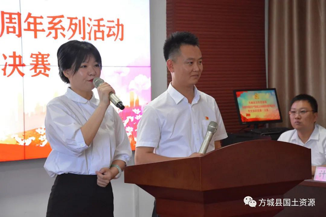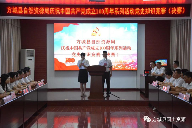 河南省方城县自然资源系统庆祝建党100周年系列活动之党史知识竞赛圆满落幕“党的根本宗旨是什么”“全心全意为人民服务”“恭喜你,答对了,加上10分……”6月9日,在方城县自然资源局庆祝建党100周年系列活动之党史知识竞赛现场,经过层层选拔最终进入决赛的10支代表队30名选手们,火力全开,以智慧对决,凭实力比拼,带来了一场精彩绝伦的“学四史、守初心”党史知识竞赛。
