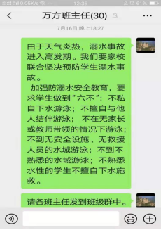 防溺水——焦作市万方中学暑假在行动时间:2021-07-26 暑假到了,为了进一步加强防溺水教育,保证学生的生命安全,焦作市万方中学每星期进行了不少于两次的安全提醒。