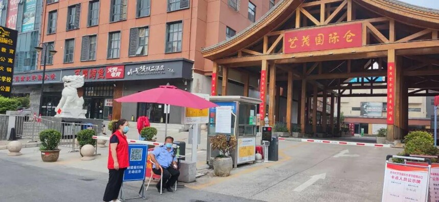 烈日下志愿者们在同样的地方,不同的光线里重复着关于汗水和温情的故事。艺茂国际仓的门口,志愿者们组织商户、顾客有序排队、测温扫码、引导入场、向长者进行耐讲解和帮助。她们或穿梭在人群中维持队伍秩序,保证一米的间隔距离;或耐心的为大家解疑答惑并不断提醒群众规范佩戴口罩。