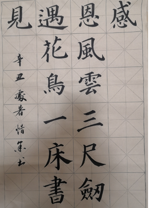 大鹏教育书法学院学员“指尖艺术”作品赏析 “指尖艺术”是大鹏教育书法学院的一名学员,刚退休的她因为突然闲下来十分不适应,每天待在家总觉得哪都不舒服,直到一次偶然的机会知道了大鹏教育,在书法学院学习以后不仅丰富了她的业余生活,连人也变得越来越自信了。她表示:“59天前,我手握毛笔哆嗦嗦,不懂运笔的起、行、收,这59天,我除了学到不少书法知识,也更深地体验到书法是纸上太极,需要夯实基本功。感谢教我隶书的砚语老师,他和蔼可亲、功底厚实,给了我书法的启蒙以及不断努力的信心。”