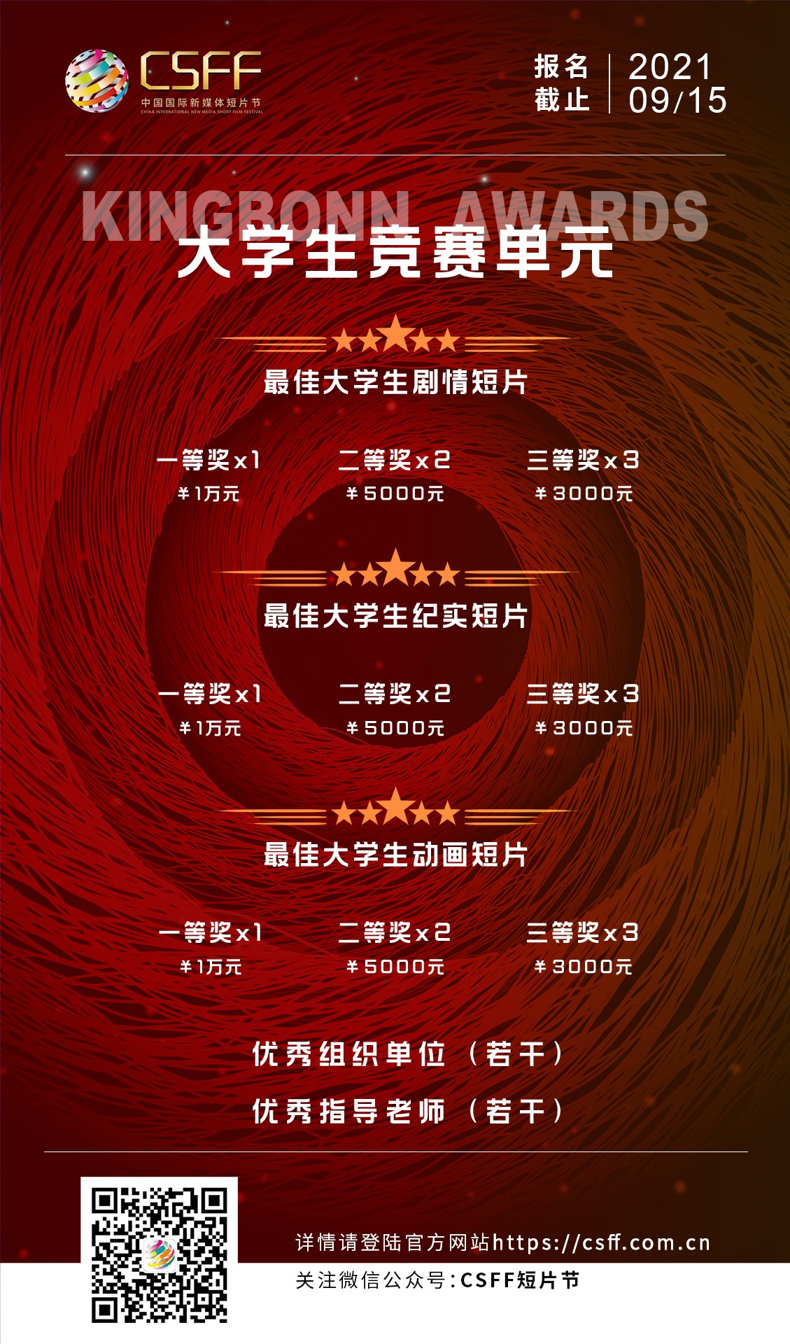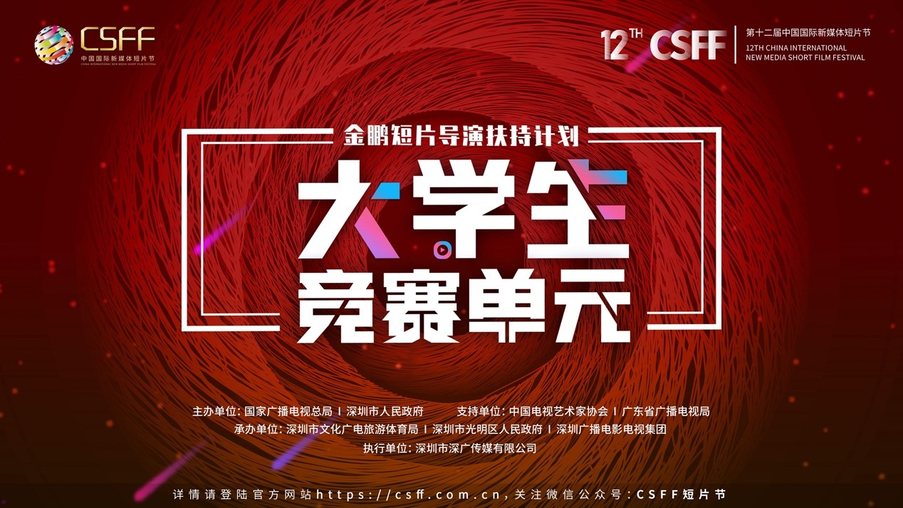 第十二届中国国际新媒体短片节金鹏短片导演扶持计划大学生竞赛启动征片回首2020,星光熠熠 2020年第十一届中国国际新媒体短片节(简称CSFF短片节)金鹏短片导演扶持计划大学生竞赛单元燃起精彩的火花,一颗颗新星在CSFF短片节的舞台上闪耀,展现自我,成就梦想! 第十一届CSFF短片节金鹏短片导演扶持计划最佳大学生短片《未婚妈妈》 预见未来,星辰大海 即将到来的秋天,迎来了新一届中国国际新媒体短片节金鹏短片导演扶持计划大学生竞赛单元。用镜头捕捉瞬间,用语言讲述生活,用创意表达思想,用个性抒发人生——来自象牙塔一颗颗闪耀的新星,即将照亮青春影像创意的征程! 第十二届中国国际新媒体短片节“金鹏短片导演扶持计划”大学生竞赛单元的申报通道现已全面开启,我们在此向全国大学生青年创作者发出最诚挚的邀请!期待您携最具张力与创意的短片作品,为不平凡的2021年献礼! 2021年再出发,第十二届中国国际新媒体短片节“金鹏短片导演扶持计划”大学生竞赛单元的扶持项目设置如下: 金鹏短片导演扶持计划·大学生竞赛单元 中国国际新媒体短片节经过11年的发展,现已成为国内外业界一致认可的、具有国际影响力的短片节。“金鹏短片导演扶持计划”是CSFF短片节一项重要的竞赛活动,旨在发掘优秀青年短片导演,鼓励与扶持青年导演创作。11年来,该计划已累计收到了全球163个国家和地区的42834部参赛短片。 大学生竞赛单元是“金鹏短片导演扶持计划”常设单元之一,面向全国高等院校学生,旨在鼓励高校学生创作有思想深度、有艺术品味的优质短片,发现和培养大学生影视创作人才。2020年,大学生竞赛单元共收到来自全国近100所高校的1694部参赛作品,参赛作品数量在所有国内参赛作品总数中占比58%,大学生创作者一跃成为短片创作的中坚力量,凸显了新时代下年轻创作者对短片以及短视频的无限热情和兴趣执着。 2021年金鹏短片导演扶持计划·大学生竞赛单元由短片节组委会与新知时代、中广学伴联合宣传推广,为全国大学生提供一个广阔的展示平台。大学生竞赛单元承载着大学生的梦想,鼓励大学生创作者们勇于发现和思考,用年轻的视角记录身边万物,并善于使用全新智能化工具和传播手段,进行影像创意表达,创作出具有时代特色的大学生短片。 |