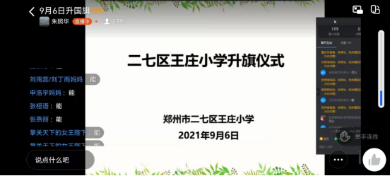 郑州市二七区王庄小学:线上升旗仪式 让红领巾在“云端”高高飘扬时间:2021-09-06 面对防控疫情这个特殊的时期,同学们虽然不能如期回到学校上课,但是学校对学生们的爱国主义教育一刻也没有减少。9月6日上午8:30,郑州市二七区王庄小学全体学生整齐地佩戴着红领巾和全体教师一起,在网络上举行了一场“不一样”的升旗仪式。