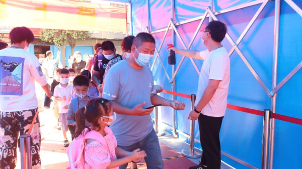 经过测温,消毒,孩子们跨过彩虹门进入心仪已久的校园。