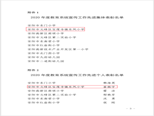 文峰区东风小学荣获区教育系统宣传工作先进集体时间:2021-09-16 近日,在《文峰区教育局关于表彰2020年度教育系统宣传工作先进集体和先进个人的决定》中,宝莲寺镇东风小学被评为先进集体,该校崔振宇老师获得先进个人称号。 2020年,东风小学在《安阳日报》、《河南省教育网》、《教育文摘周报》等新闻媒体发表稿件158篇。通讯员紧紧围绕学校的教育教学工作,写出了一篇篇新闻宣传稿件,全面、及时、准确反映了学校党建工作、教育教学、文明创建、安全工作、校园文化建设、疫情防控等方面的成果。记录了师生成长奋进的身影,见证了学校脚踏实地的前进步伐,讴歌了东风教育人全力以赴、持之以恒,为党育人、为国育才的豪迈气概。 东风小学一直非常重视新闻宣传工作,成立了新媒体工作室,开通微信公众号、微博等平台官方号,采用图文、视频、直播等多种形式将学校的发展陆续向社会进行宣传展示,为学校发展营造了良好的社会舆论氛围。 |
