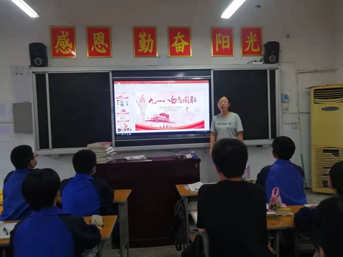 教师向学生讲述“九一八事变”的过程,使学生了解90年前的那场战争。“九一八事变”拉开了中国长达14年的抗战序幕,无数的中国人倒下了,但他们精神永存,他们的名字镌刻在中华大地上,留存于人民心中。纪念英烈,教育后人,在教师的带领下,学生为浴血牺牲的英雄集体默哀三分钟。