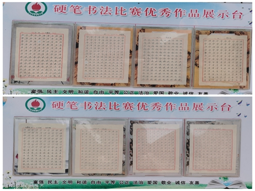 学校采用书法展示台,展示各个年级的优秀书法作品,并每周更换一次书法作品。