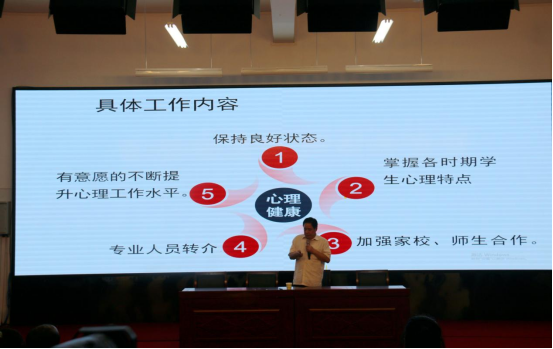 讲座以《用爱来滋润学生》为题目,以教师如何了解学生心理状态、处理好与学生之间的关系为主题,着重提高教师的心理素质,促进身心和谐可持续发展,以积极的心态对待新学期的工作和生活。