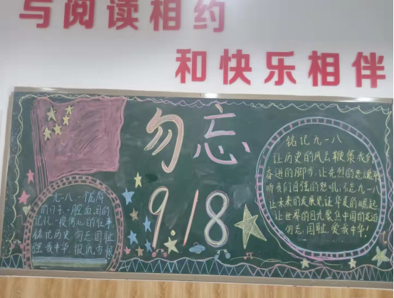 学校通过国旗下演讲,电子屏滚动播出“勿忘国耻,居安思危,前事不忘后事之师”,时刻警醒学生,落后就要挨打,吾辈要自强的信念,各年级根据年龄特点,开展了不同的爱国教育活动。三年级开展了“铭记历史 勿忘国耻”的主题队会。老师用简洁明了的语言,运用图片、视频对学生进行九一八事变历史事件的讲述,让学生对那段惨痛的历史进行了解。学生自己也搜集资料等形式,激发学生的爱国热情。四年级主办了“勿忘国耻 居安思危”黑板报报。五年级制作了内容丰富,色彩明艳的手抄报。六年级集体在报告厅观看了爱国电影。通过这一系列的主题活动,让孩子们从小把爱国放在心底。有国才有家,国强才民安,让学生更加的爱国,团结才是力量,才能抵抗外来侵略力量。