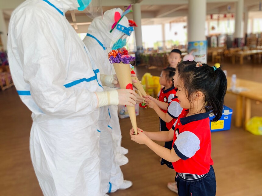 核酸检测我不怕 全民抗疫我先行时间:2021-09-23 教育文摘周报9月23福建电(记者 陈强 艾模钦 通讯员 温扬莉)针对福建省内突如其来的疫情蔓延问题,近日,福建省三明市泰宁县丹霞幼儿园进行了全员核酸检测。在检测之前,家园合作,各班级老师与家长通过观看视频、图片以及角色扮演、情景模拟等等,提前让小朋友们了解做核酸检测的原因以及流程,消除孩子们对未知的恐惧。 医护人员在炎热的天气身穿防护服来到泰宁县丹霞幼儿园,他们化身成为勇敢的战士,为我们的健康提供保障。在采样过程中,10 人为一组,小朋友们胸口贴着姓名牌,保持着一米的距离,有序站成一排安静的等待,都表现的特别勇敢,主动张大嘴巴,配合医护人员的采样。老师们对幼儿进行心理安抚,协助医护人员对检测名单进行核对,不漏一人,不错一人。最后,为了表达对医护人员的感谢,孩子们为他们献上一束花。 此次核酸检测采样工作对全体幼儿和教职工进行了精确的排查,为幼儿园师幼的身体健康筑就了一道坚不可摧、牢不可破的防线。 |