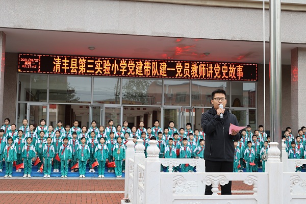 少先队员杨优乐在国旗下动情演讲,少年强,则国强。爱国从现在做起,努力学习,自强不息,做一个合格的红色接班人! 五(6)中队辅导员杨艳东和队员们畅谈透过党史读中国,缅怀烈士树理想。她号召少先队员在庆祝祖国母亲72周年华诞之际,牢记嘱托,强信念、跟党走,争做红色接班人,继承革命先烈未竟之志,在新时代的长征路上勇敢向前! 党员教师讲党史故事,政教处王鹏举主任声情并茂讲述《董存瑞炸碉堡》的革命英雄故事,号召新时代少先队员传承英烈革命精神,珍惜现在美好生活,好好学习、天天向上,准备着,为祖国的现代化建设贡献力量。“请党放心,强国有我!”的铮铮誓言再次传遍校园。 百年党史波澜壮阔,七十二载辉煌成就,伟大祖国繁荣富强,中华儿女幸福安康!红色传承从小做起,红色基因一脉相承,红色少年立下宏志,红色旗帜永放光芒!(濮阳市清丰县第三实验小学 崔向羡 苏茂轩 王保安) |
