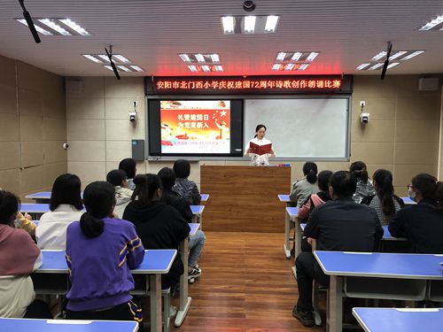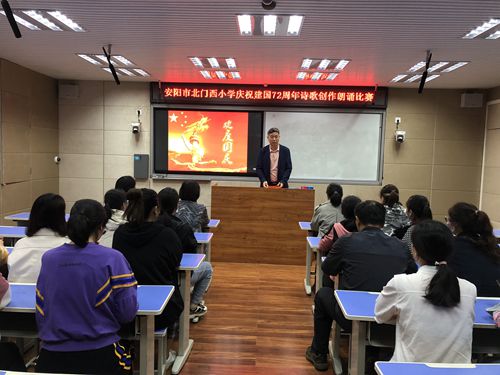 礼赞建国日 为党育新人——安阳市北门西小学开展诗歌创作朗诵比赛时间:2021-09-27 9月28日,安阳市北门西小学组织教师开展了以“礼赞建国日,为党育新人”为主题的诗歌创作朗诵比赛。 教师以动人的声音、炽热的情感,用一首首自作诗歌,歌颂共产党人奋斗拼搏的丰功伟绩,描绘党和祖国事业蒸蒸日上的宏伟蓝图,一首首自作诗歌,洋溢着对党的热爱,对祖国的赞美,对人民幸福生活的美好祝愿,真切表达了教师对建国72周年的深切祝福,抒发了对党对祖国的热爱之情。整个比赛过程,情绪高昂,气氛热烈。 此次朗诵比赛是一次心灵的洗礼,安阳市北门西小学将继续以学为基,传承党内教育优良传统,不断用党史、国史这些“丰富生动的教科书”来教育人、启迪人、感化人、鼓舞人,将教育者的初心在“为党育人,为国育才”的路上行稳致远,为建国72周年献礼!