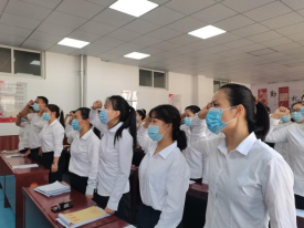 德育副校长黄丽娜为领誓人,全体教职工姿态端庄,神态严肃,右手握拳,大声跟读誓词。