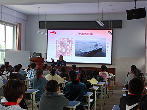 李局长就孟晚舟事件、美帝的鬼胎、中国当自强三方面内容进行讲解,并向学生介绍祖国的伟大成就,抒发“如果信仰有颜色,那一定是中国红”的豪迈之情。
