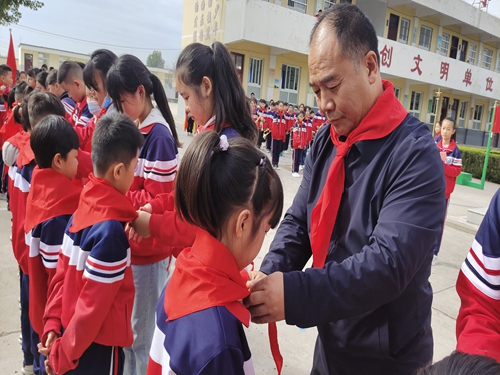 文峰区东风小学举行建队日新队员入队仪式时间:2021-10-11 为了庆祝新中国成立72周年,庆祝少先队建队72周年,发挥少先队的独特功能,教育引导广大少先队员积极投身校内外实践,从小事做起,从身边做起,努力争做新时代的好队员,用实际行动把红色基因一代代传下去,进一步推进学校少先队工作的不断发展。文峰区东风小学于10月11日举行了“红领巾心向党”建队日新队员入队仪式。 建队日前,东风小学二至六年级的少先队员在辅导员的带领下,结合红领巾实践体验活动,积极学习少先队礼仪,做到六知六会,在中队集中讲解、述说、分享自己和红领巾的故事,使自己的小梦想融入祖国发展的大追求中。 入队仪式上,少先队员们激情澎湃,准备入队的队员个个精神饱满,脸上洋溢着笑容。队员们跟随赵霜老师的指挥,高唱队歌,校领导和六年级的老队员郑重为新队员佩戴红领巾,将责任与信念传递,预示着东风小学少先队员队伍的不断壮大。 在鲜艳的队旗下,新老队员高举右拳,神情庄重,一起跟随大队长朱雅轩庄严宣誓。一条条鲜红的红领巾,一面面队旗,预示着东风小学的少先队员们将更加奋发向上,努力拼搏。 董晨毅校长的讲话催人奋进,董校长代表学校向新入队的少先队员表示祝贺,他指出:新时代的少年儿童应该以先锋为榜样,在生活和学习中争做先锋。强调全体少先队员要积极面对生活和学习中的困难,做有责任心、有理想的新时代少先队员。 通过本次建队日活动的开展,不仅壮大了学校少先队员队伍,更弘扬了少先队的光荣传统,培养了少先队员热爱少先队组织的情感,增强了少先队员的光荣感和自豪感。