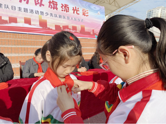 学校少先大队在学校操场组织举行庄严隆重的建队日新队员入队仪式。合唱嘹亮的《中国少年先锋队队歌》,辅导员宣读新队员入队仪式,新老队员重温入队誓词,老队员为新队员佩戴红领巾,新老队员互敬队礼,新老队员代表发表感言,辅导员讲解队旗的由来寓意,校领导对少先队员寄予殷切的希望等,整个入队仪式中,少先队员们的表情个个庄重而又严肃,每一个环节都认真地倾听,接受着洗礼和升华。