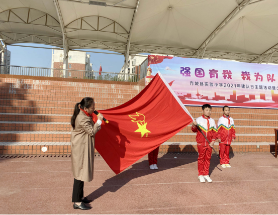 强国有我 我为队旗添光彩——南阳市方城县实验小学2021年少先队“建队日”新队员入队仪式少年儿童如初升红日,光芒万丈,如奇花蓓蕾,灿烂明丽。 为纪念少先队建队72周年,高举队旗跟党走,传承红色基因,发扬爱党、爱国精神,提升全体少先队员的信念感与使命感,2021年10月13日上午,中国少年先锋队方城县实验小学大队隆重集会,举行了“强国有我 我为队旗添光彩”为主题的10.13建队日2020级第二批新队员入队仪式。