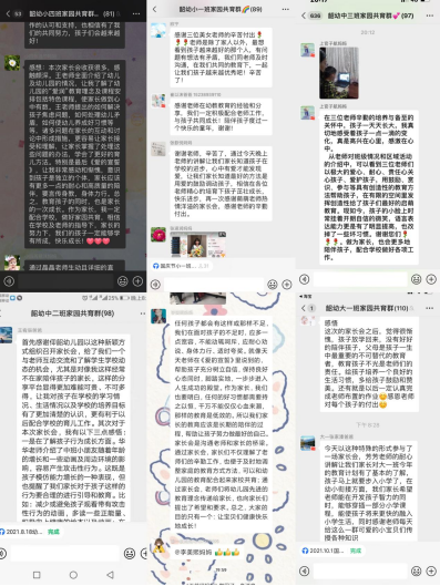 家园共育一“线”牵,虽然隔着屏幕,同样能感受到家长们真挚与热情。会议结束之后,家长们纷纷表达自己的收获和感想,真诚质朴的话语是对幼儿园工作的肯定和支持,对老师辛勤工作的感谢!这一次从心出发的沟通,拉近了家长与老师之间的距离,为今后更好地开展家园共育工作奠定良好的基础。(三门峡市渑池县仰韶幼儿园 孙静) |