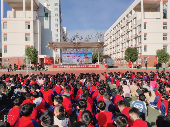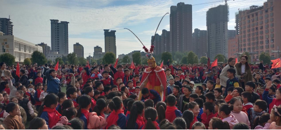 欣赏戏曲美学,感悟传统文化——戏曲进校园走进周口市郸城县第二实验小学教育集团本部校区“齐天大圣来啦!”足球场一片欢呼声。10月18日上午,由周口市郸城县县委宣传部、县文广旅游局、县教体局组织开展的戏曲进校园活动走进郸城县第二实验小学教育集团本部校区。全校4000余名师生观看了由县豫剧艺术中心的演员们带来的精彩表演。
