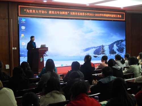 为党育人守初心 赓续百年创辉煌——安阳市东南营小学师德师风建设会时间:2021-10-27 为进一步加强师德建设,努力建设一支有理想信念,有道德情操,有扎实学识,有仁爱之心的教师队伍,10月25日,安阳市东南营小学2021-2022学年师德师风建设工作会议在南校区学术厅举行。学校党支部书记兼师德师风建设领导小组组长冯芳校长亲自主持,并发表讲话。 冯校长以“为党育人守初心,赓续百年创辉煌”为主题,细品18位职评老师的述职演讲,提炼出让人心疼、心酸、欣慰、欣喜的瞬间,让身边的榜样成为我们前行的力量。 这些老师都不再年轻,他们在自己的岗位上一做就是十几,二十几年,甚至三十几年。可他们依旧不忘初心,孜孜以求,他们给自己的坚守冠名:是爱,爱你们,爱学校;是希望,心中有希望,我们共成长;是实干,加油干,干就行了;是不负厚望,始终有一份坦然和安宁。 老师们的实干精神、动人话语,都被冯校长一字一句记录下来,再次展示在大家面前,让教师记住了他们的最美瞬间。 |