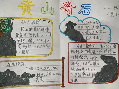 妙笔生花赏奇石——安阳市红庙街小学二年级组特色仿写时间:2021-10-29 闻名中外的黄山风景区,奇峰罗列,怪石嶙峋,景色神奇,十分有趣。为了培养孩子的想象力,体会黄山奇石有趣,10月29日,安阳市红庙街小学二年级组结合课后习题,根据图片中石头的形状,展开想象,特色仿写。 孩子们根据图片中石头的形状展开想象,用上“好像”说一说,画一画,写一写,鼓励孩子们运用积累的词语,或本课新学的词语。引导有兴趣的学生模仿课文给这些奇石起名字,再写一段介绍,图文并茂,相得益彰。 一块块本无生命的石头,被孩子们描绘的活灵活现,经过这次课文仿写练习,孩子们一定更喜爱黄山奇石,更愿意欣赏黄山奇石。同时也提高了学生的写作兴趣。 |