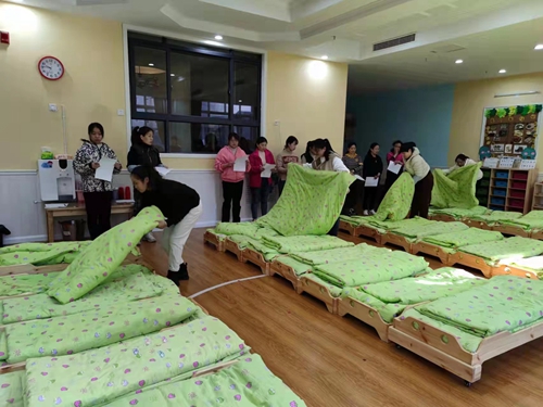 为提高幼儿园保育教师日常工作实践技能,规范保育教师工作细则,促进保育教师队伍整体素质的提高。近日,安阳市九府幼儿园组织保育教师举行了一场别开生面的 整理床铺技能比赛。