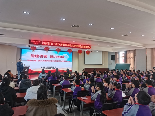 安阳市三官庙小学被授予省义务教育标准化管理特色校时间:2021-11-26 2021年7月,河南省教育厅公布了“河南省第二批义务教育标准化管理示范校和特色校”评审结果,安阳市三官庙小学被评为“党建特色校”。11月25日,安阳市教育局基础教育科副科长刘琪玮一行三人,在文峰区教育局相关领导的陪同下,来到三官庙小学,为学校颁授“河南省第二批义务教育标准化管理特色校”奖牌。三官庙小学支部书记、校长李红婷代表学校接受了特色校牌匾,学校部分教师和学生参加了此次活动。 授牌仪式前,刘琪玮一行参观了学校文化和党建文化的建设成果,观看了学校开展“红色教育与思政课融合创新”的纪录片,对学校的党建工作进行了调研指导。 授牌仪式上,刘琪玮宣布了授予三官庙小学“河南省第二批义务教育标准化管理特色校”的决定,并对学校表示祝贺。她指出,省教育厅对示范校、特色校实行动态管理,每3年为一个创建周期,期满后经省、市两级检查考核,合格的继续保留,不合格的予以摘牌,期满验收合格的特色校可以重新申请创建示范校。她希望学校党支部不但要做好自身建设,还要按照特色校创建标准结对帮扶1-2个薄弱学校的党建工作,起到以党建促教学、以党建促发展的引领作用。 三官庙小学表示将把本次授牌作为新的起点,坚决贯彻《关于深化教育教学改革全面提高义务教育质量的意见》及《义务教育学校管理标准》,紧紧围绕《河南省义务教育标准化管理示范校评估指标体系》,落实三年提升计划,发挥党组织的统筹、引领和保障作用,坚持党组织对学校教育教学工作的全面领导,把党建工作质量的提升作为落实立德树人根本任务的重要政治保障,努力办好人民满意的学校。 |
