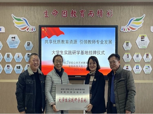 安阳市西大街小学大学生实践研学基地挂牌仪式时间:2021-12-07 为推动安阳工学院大学生校外教学实践基地的建设,12月3日,安阳工学院公共艺术教育教学部与安阳市西大街小学联合举行“大学生教育实践研学基地”签约暨挂牌仪式。 安阳工学院公共艺术教育教学部党总支书记孙晓洪、李一主任、杨剑副主任、音乐鉴赏教研室主任李金霞、传统文化鉴赏教研室主任杨玉英、西大街小学全体领导及教师代表参加本次活动。 付明朝校长代表全校师生对此次莅临指导工作的高校领导表示热烈欢迎。他指出:美育是丰富想象力和培养创新意识的教育,能提升审美素养、陶冶情操、温润心灵,激发创新创造活力。安阳市工学院公共艺术教育教学部在学校设立大学生实践研学基地,给学校创造了深挖内涵、促进发展的机会,高校优质资源必将助力学校美育品质的不断提升。 吴莉莉副校长介绍了学校办学的基本情况及美育建设成果。 孙晓洪书记进行重要讲话,他亲身感受到了西大街小学温暖和谐、物美人喜、积极向上的校园精神,相信通过两校加强合作,一定会呈现多元的共学、共建、共享的艺术教育成果。 李一主任表示,此次基地的建设,会加强两所学校的交流合作,同时有利于促进两校之间的教育教学改革创新,为公共艺术教育整体提升做出贡献。 与会领导到美术展览室进行参观,通过实地查看和听取介绍等形式全面了解该校美术教育教学发展,对美育实践基地合作进行了探讨。 此次教育实践基地成立,在“双减”政策的背景下,通过与高校合作,一定会促进教师发展学校的建设,助力“丹青溢彩”特色校的打造,提升教师专业发展,促进学生全面发展。 |