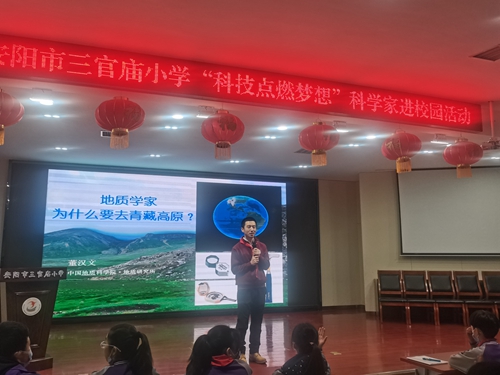 12月10日,在安阳市三官庙小学多功能厅内,一位特殊的“老师”把地球装进课堂、让矿石“说话”,通过一系列充实有趣的讲授内容极大的调动了现场300多名学生的兴趣,这个特殊的课堂是中国地质科学院,地质研究所副研究员,董汉文老师带来的地质体验课。