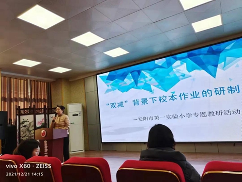 安阳市第一实验小学双减下语文大组教研活动时间:2021-12-24 12月21日,安阳市第一实验小学开展了以“双减,我们在行动”为主题的语文大组教研活动。 这个学期,是中小学全面落实双减政策的第一个学期,郭素敏老师作为一线教师,首先给大家交流了她面对“双减”的困惑与思考。 在“双减”政策下,如何更好地进行家校沟通,怎样指导学生进行有效阅读才能事半功倍?党若平主任为大家指点了迷津。 正如党主任所说:“鸟欲高飞先振翅,人求上进先读书。纵观古今中外,凡是大有作为的历史人物,都是博览群书的人。”让我们和孩子们一起爱上阅读,邂逅美丽,沐浴书香。“双减”政策下,家家母慈子孝,一片祥和,一线老师却面临着更大的压力,如何布置作业才更有效,才能让学生各方面能力都得到发展?面对这个难题,该校五年级语文老师勇于开拓,大胆创新,尝试采用一系列的创意作业,让所有学生都能在“双减”政策下乐在其中。我们在教学实践中尝试布置分层作业,根据学生个体差异,作业设计从易到难,循序渐进,既考虑了全体学生的知识水平,又照顾到个别学困生。每个单元的作业设计,既有要求全体学生掌握的基础字词,又有针对不同学习水平学生的分层作业,让学生自主选择自己能够达到的训练内容。具体如何布置每日的作业呢?彭静老师向大家做了详细介绍。如:每日书面作业分为基础作业和选做作业:基础作业必做题,以抄写记诵为主;选做题以小练笔和课后选做题为主,学生可以自由选择。全面压减了作业总量和时长,减轻学生过重的作业量,构建教育良好生态,缓解家长焦虑的情绪,促进学生能够全面发展、健康成长。 老师精心设计、细心批改,学生书写认真、及时完成,份份作业令人赏心悦目。让所有孩子都能在“双减”中有所提高,有所收获。能力一般的孩子要吃得饱,吃得好,能力强的孩子还可以自选老师设计的特色作业。特色作业如何布置呢?张琰老师向大家展示了本学期孩子们的特色作业。 怎样才能让学生强健体魄,主动参与到体育、劳动实践中?刘菲老师向大家介绍了她的教育方法。 交流活动虽然结束了,但“双减”下语文教学实践的脚步却永不停止。 |