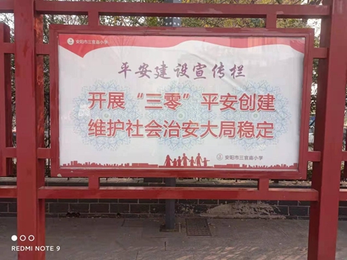 近日,为深入推进"三零"平安校园创建工作,安阳市三官庙(东明 朝阳)小学以“三零”创建为切入点,从营造安全氛围、定期隐患排查、增设小小安全监督员和护苗队入手,着力化解不稳定因素,将各类苗头、倾向性问题化解在萌芽状态,不断提高学校的综合治理能力和水平,全力创建平安、和谐、稳定的学习生活环境,积极开展“零上访、零事故、零案件”的“三零”单位创建工作。