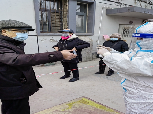 田秀娟老师和陆旻老师穿上防护服,开始了录入采集者信息工作。数九寒天,老师们却以饱满的热情坚守岗位,维护现场秩序,坚守防控警戒,组织居民保持安全距离有序排队检测,协助医生检测工作。