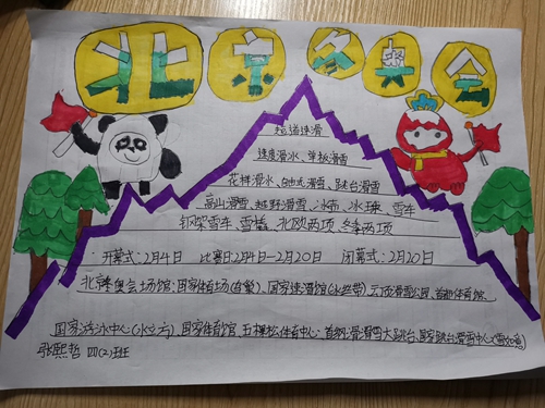 明雅活动中,学生认真学习冬奥会知识,了解冬奥会的起源及吉祥物。学生还用画笔将“冰墩墩”和“雪容融”两个吉祥物描绘出来,为冬奥加油。