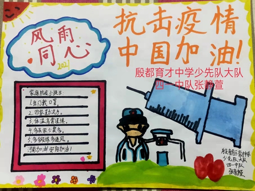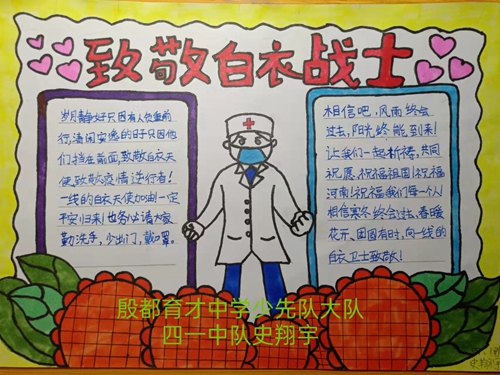 殷都区育才中学少先队员助力抗疫时间:2022-01-17 1月17日,殷都育才中学的少先队员们在做好自身防护的同时,用自己的方式加入了这场没有硝烟的战斗。 他们宅家不宅心,当起了“抗疫”后援团,以多种形式掀起了红领巾共战“疫”的热潮,传递着一份小小的抗疫力量。 少先队员们通过制作手抄报、宣传画等学习防控知识,向奋斗在一线的医护工作者和志愿者们致敬;通过录制小视频呼吁大家科学地预防新型冠状病毒的传播;通过写身边的抗疫故事表达对抗疫先锋的敬仰和对战胜疫情的信心。 从小学先锋,长大做先锋。这场没有硝烟的战争中,殷都育才中学的少先队员们各尽其能,积极贡献力量,用实际行动践行着听党话、跟党走的初心,充分展现了“红领巾”的风采。 |