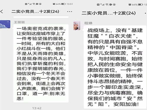 文峰区第二实验小学党员身先士卒抗疫情时间:2022-01-20 面对疫情,近日,文峰区第二实验小学的党员同志身先士卒,积极走在疫情防控第一线,为抗疫助力。 1月7日,为进一步贯彻落实上级疫情防控工作会议精神,党支部书记贶宝锐同志召开了全体师生紧急疫情防控工作部署会。会上,全面部署了疫情防控工作,贯彻落实了防控要求,以高度责任感为全校师生的安全健康保驾护航。 1月9日,召开疫情防控及工作视频会议,二实小全体教师参加。贶宝锐同志对近期学校疫情防控工作进行了统筹安排,同时强调一定要竭尽全力把防控工作做实做细。 1月11日,根据区疫情管控指挥部要求,全区中小学教师下沉到社区核酸检测点参加志愿者活动。1月12日,二实小党员同志冲锋在前,带领各组教师成员按时到达各社区核酸采集点,辅助社区和医护人员,维持秩序,信息采集,保证了核酸检测的快速有序进行。 1月13日,名班主任工作室负责人郜艳芳同志代表学校,为汤阴育才学校隔离的同学精心挑选课外读物。 1月19日,全民核酸检测还在进行中,课堂上,他们是师者,疫情下,他们就是战士。他们依旧在抗疫一线,用行动书写责任和担当。 没有从天而降的英雄,只有挺身而出的凡人。平安时,默默耕耘,无私奉献;危难中,逆向而行,守护一方安宁;这就是党员本色。 |