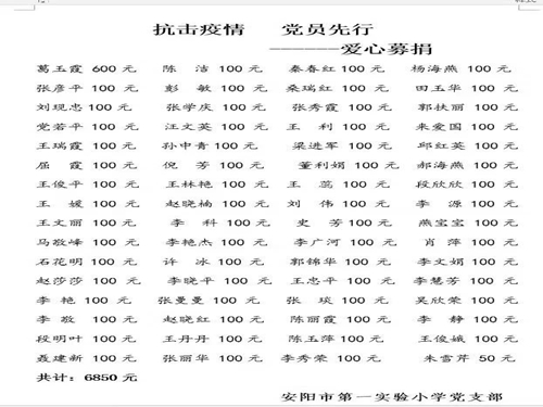 安阳市第一实验小学党员教师向抗疫一线捐赠防疫物资时间:2022-01-20 为向一线抗疫人员献上一份党员的力量,1月18日,安阳市第一实验小学党支部向全体党员发出爱心捐款倡议。 抗疫爱心募捐号角一吹响,全国五一劳动奖章获得者、河南省劳模、党支部书记葛玉霞同志带头做表率,其他党员同志积极响应号召,踊跃捐款,短短一下午,全校党员共捐款6850元,以实际行动支持疫情防控、践行初心使命。 1月20日,安阳市第一实验小学支部成员在党支部书记、校长葛玉霞同志的带领下,来到文峰区东大街街道办事处和光华路街道办事处慰问社区疫情防控一线工作人员,并捐赠爱心防疫物资,以实际行动凝聚起抗击疫情的坚强力量。 全体党员为社区送去了防护服、方便面、火腿肠等防疫生活物资,切实支援社区的疫情防控工作。葛玉霞书记向奋战在一线的社区防疫人员表示感谢,详细询问了目前社区管控情况,并表示学校将持续支持和帮助社区,坚决打赢这场疫情防控阻击战。 办事处工作人员对学校的大力支持和帮助表示衷心地感谢,并表示一定会严格贯彻落实上级各项疫情防控政策,以最饱满的状态投入到社区的疫情防控中。 磨难压不跨,奋起正当时。该校广大党员教师不仅以实际行动投身防疫战斗一线,还踊跃为疫情防控提供力所能及的帮助和支持,充分展示出党员的模范带头作用和新时代教师的良好精神风貌。 |
